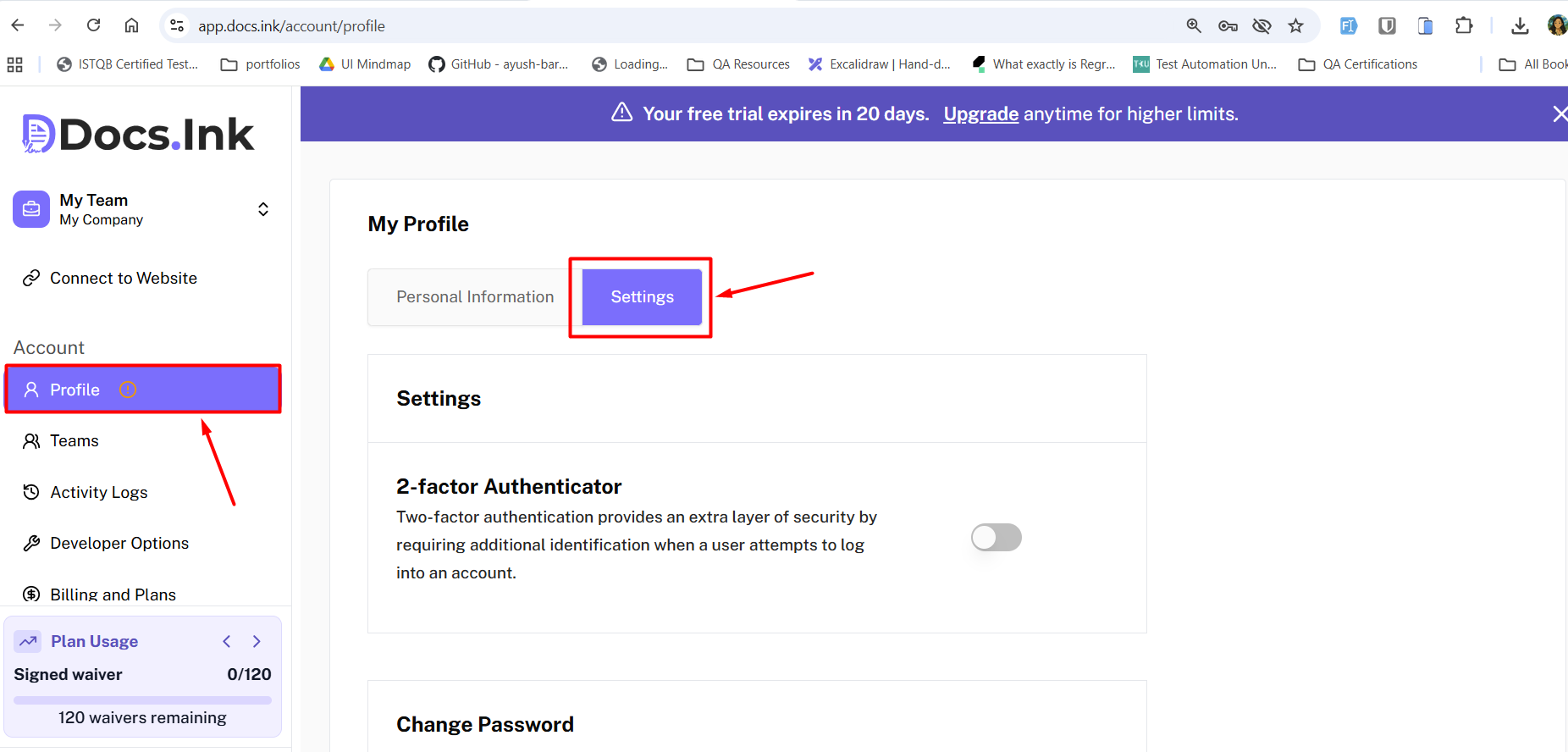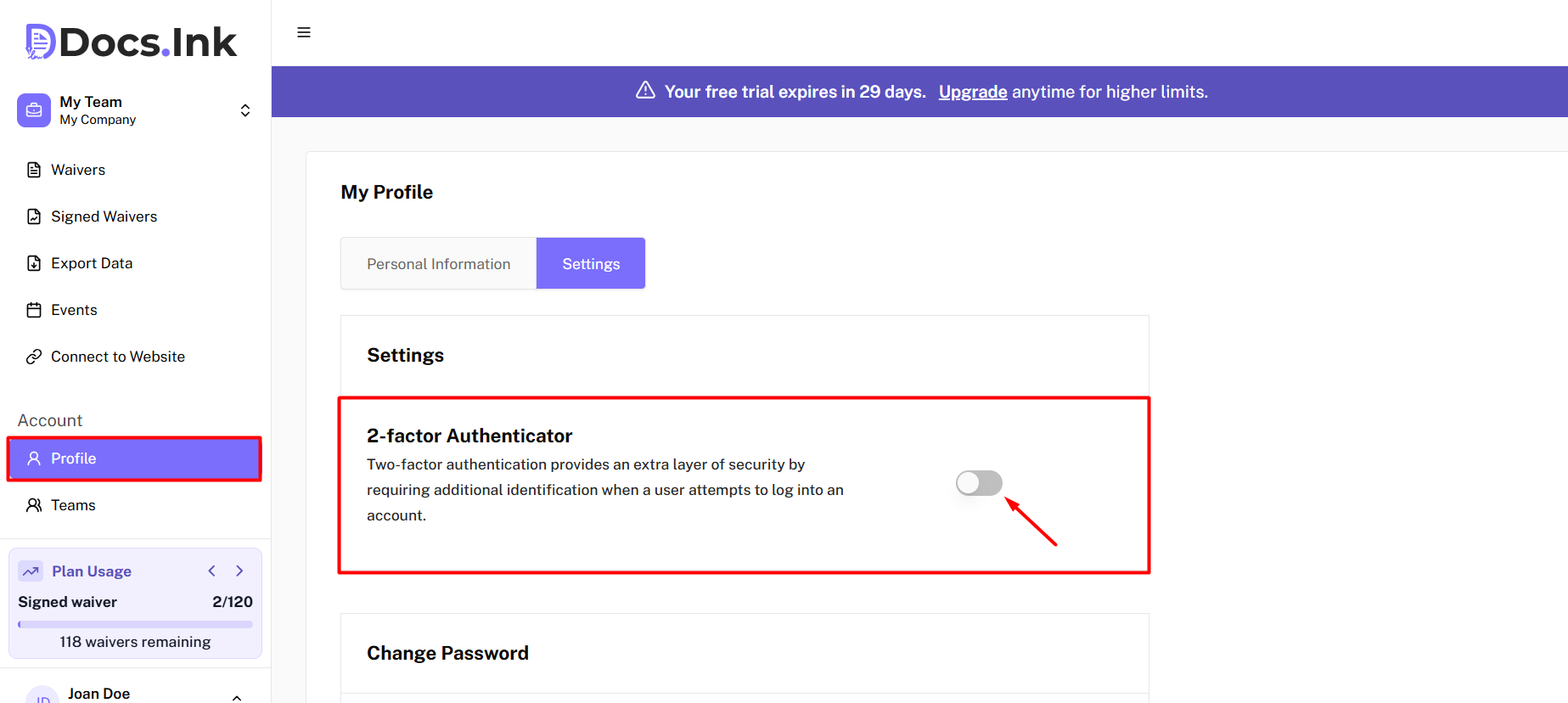 Follow the steps below to enable Two-Factor Authentication (2FA) for your Docs.Ink account. 2FA adds an extra layer of security by requiring a second form of verification in addition to your password.