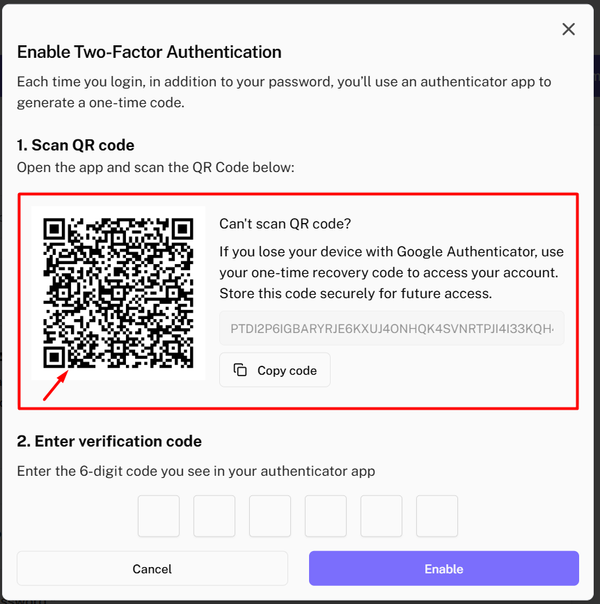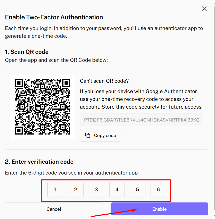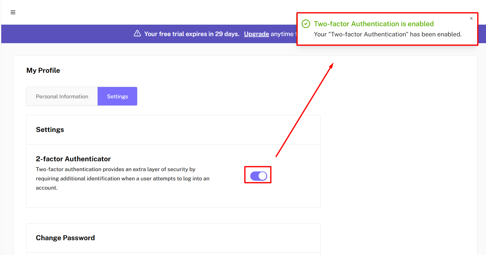 In Settings, locate the “Two-Factor Authentication (2FA)” section. → Enable the button.