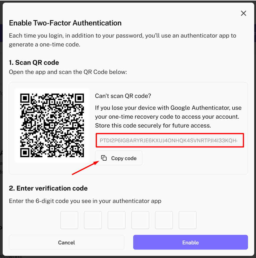 - Copy Code: Copy the provided code and manually enter it into your authentication app.