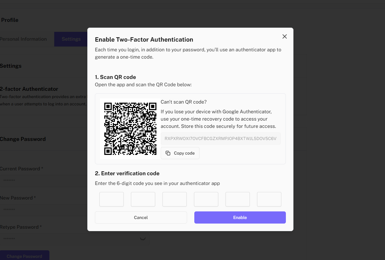 - You’ll receive an on-screen message: “2FA enabled successfully.”
