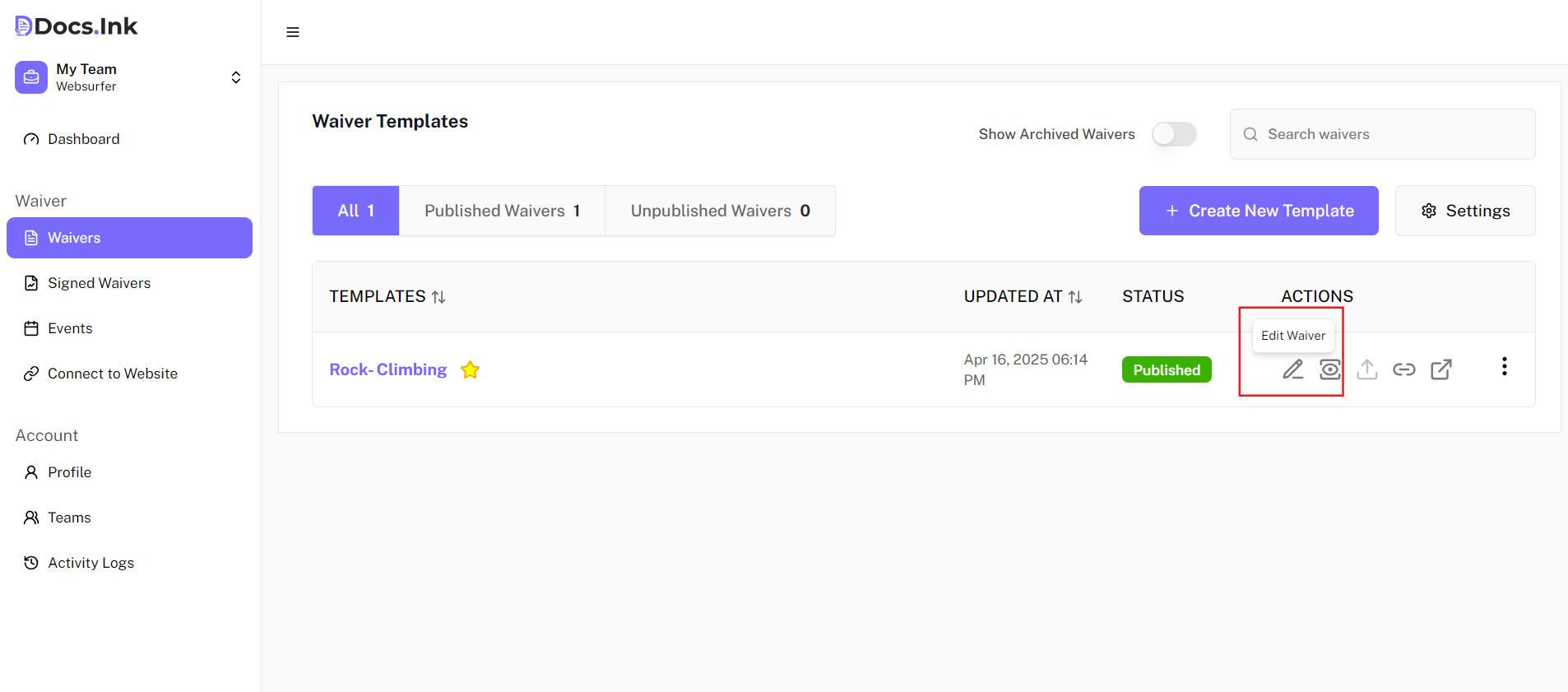 Click the Edit/pencil icon on the waiver template you wish to edit.