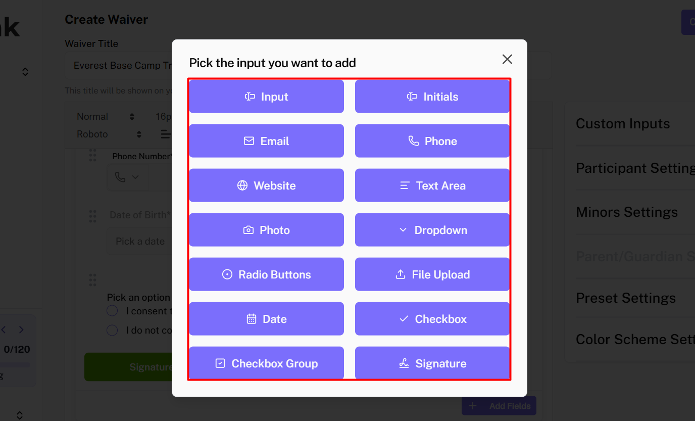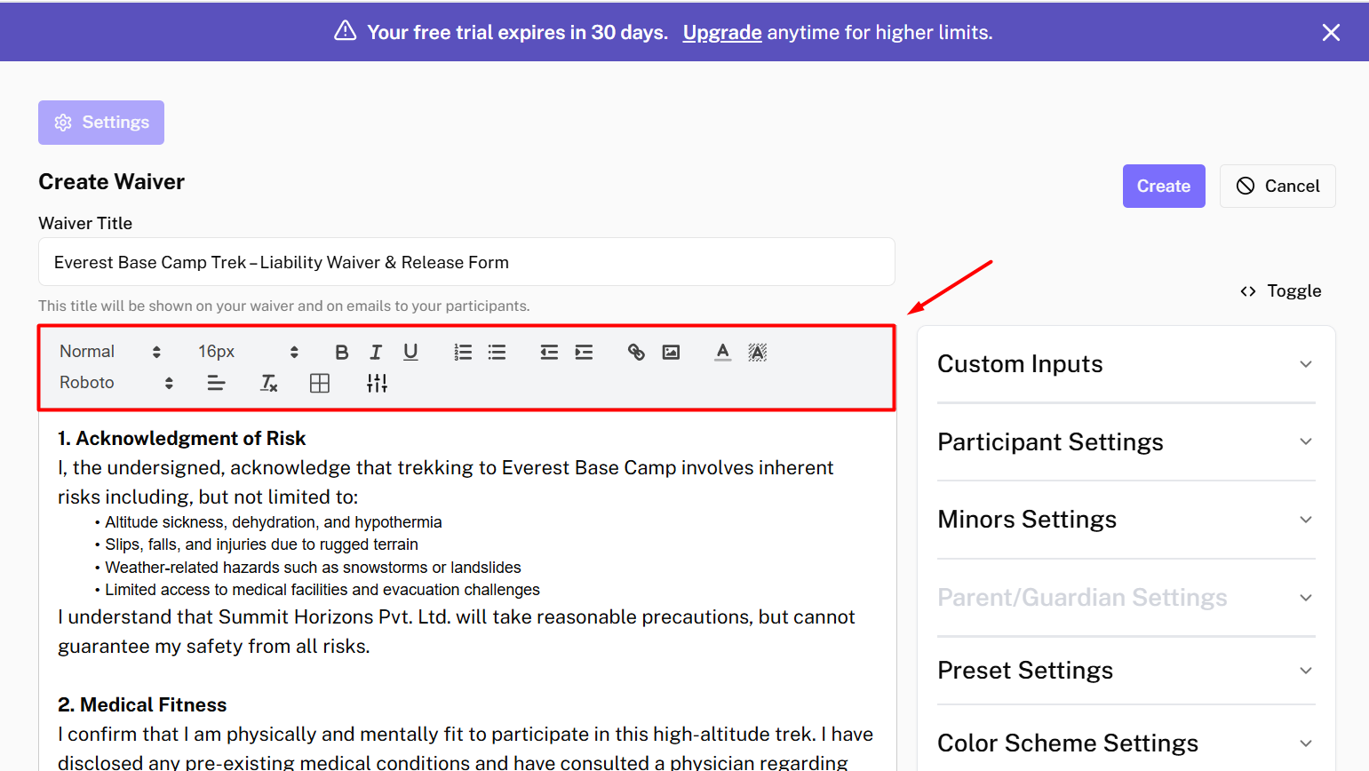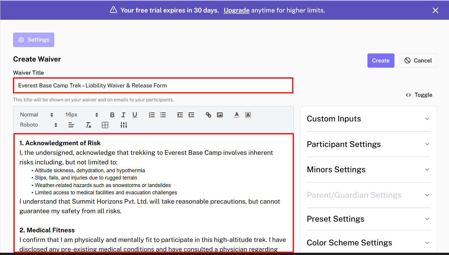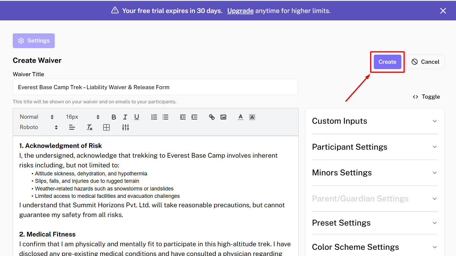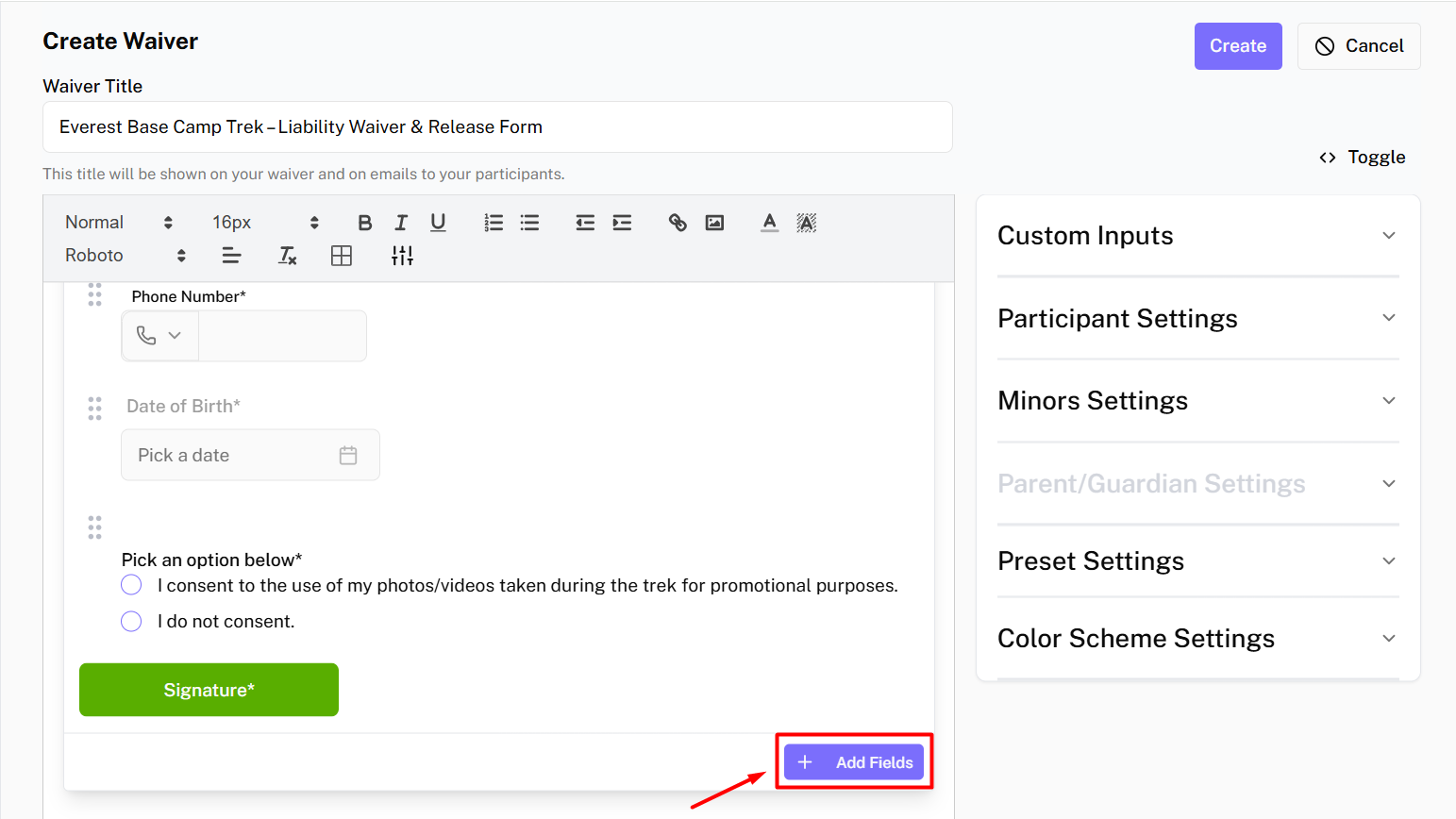 After adding all the necessary content and fields, → Click on Create button to create your waiver.