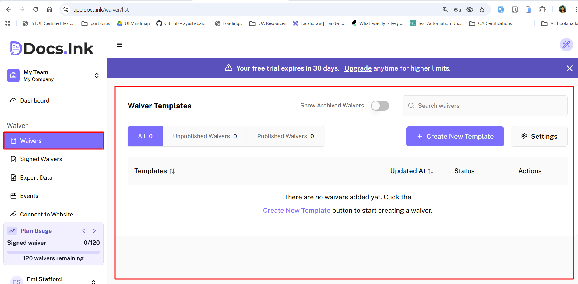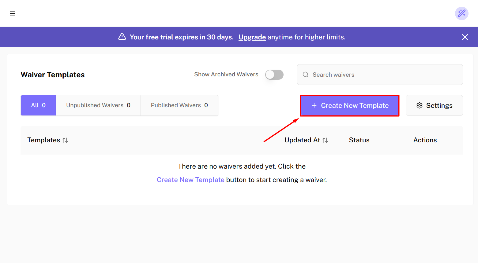 Once you’re in Waivers Tab, click on + Create New Waiver button to start creating your waiver. Read the Info on Getting Started dialog box and Click on ✓ I understand button.