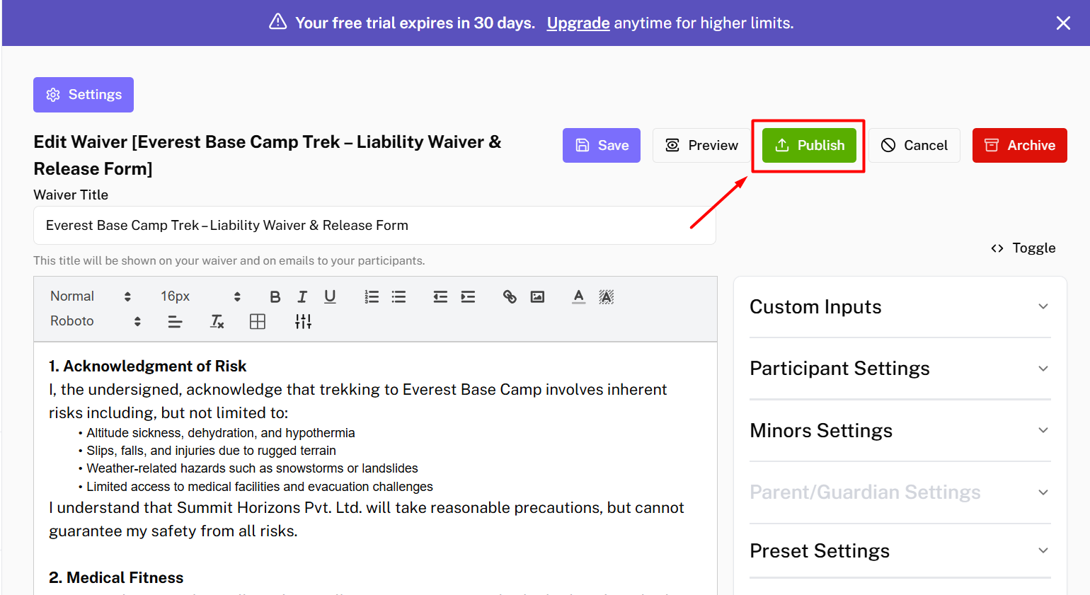Then, → Click on Publish button to make your waiver live. Your waiver is now live and ready for signing!