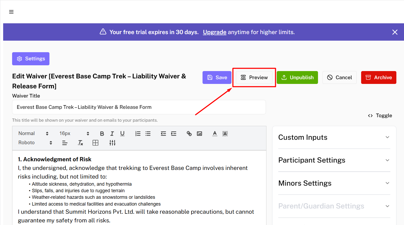 → Click on Preview button on top of the waiver editor to see how your waiver looks.