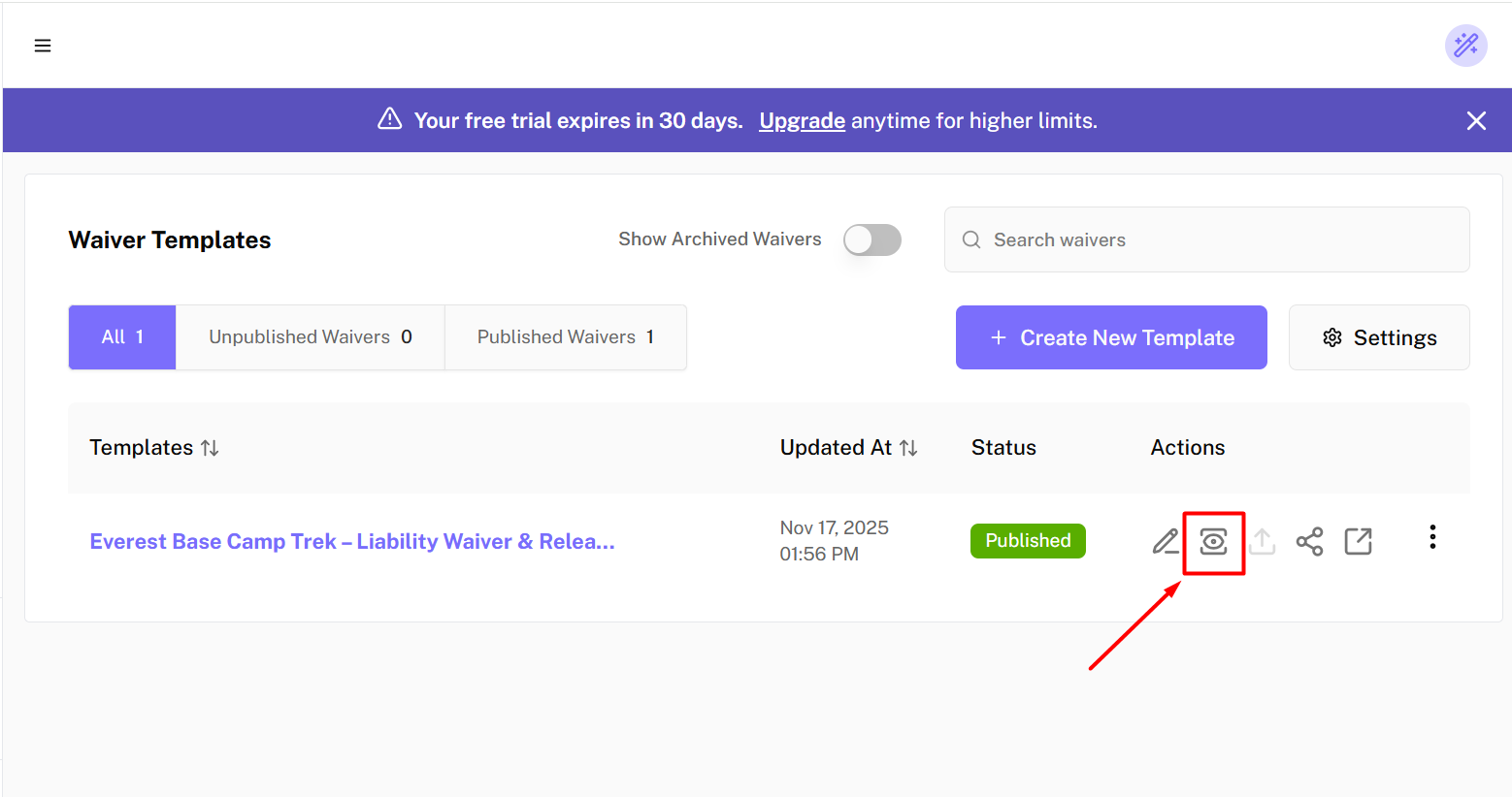 → Click on Preview button in the waiver list to see how your waiver looks.