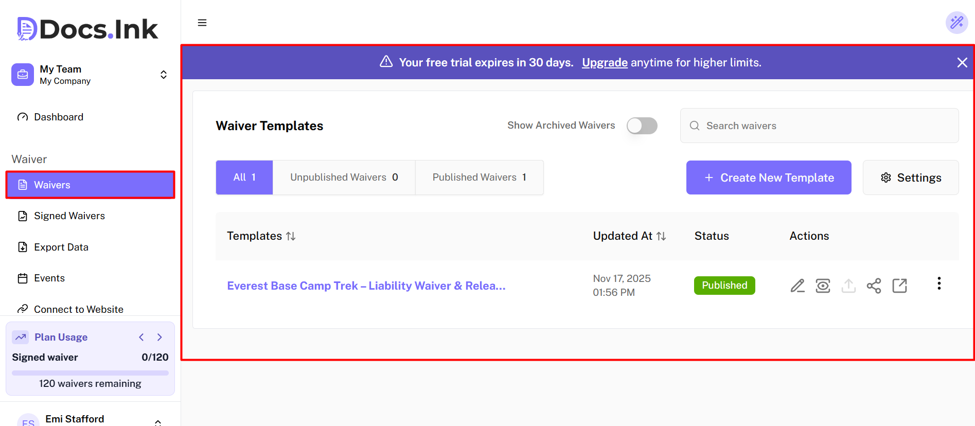 Once you’re in Waivers Tab, → Click on the Waiver you want to preview from the Waivers List.