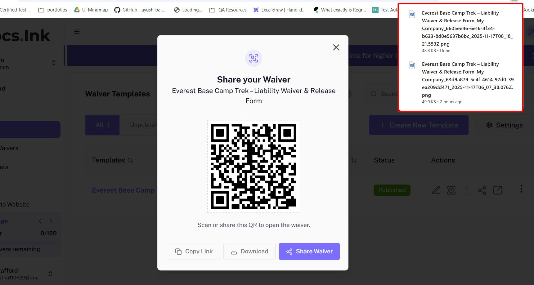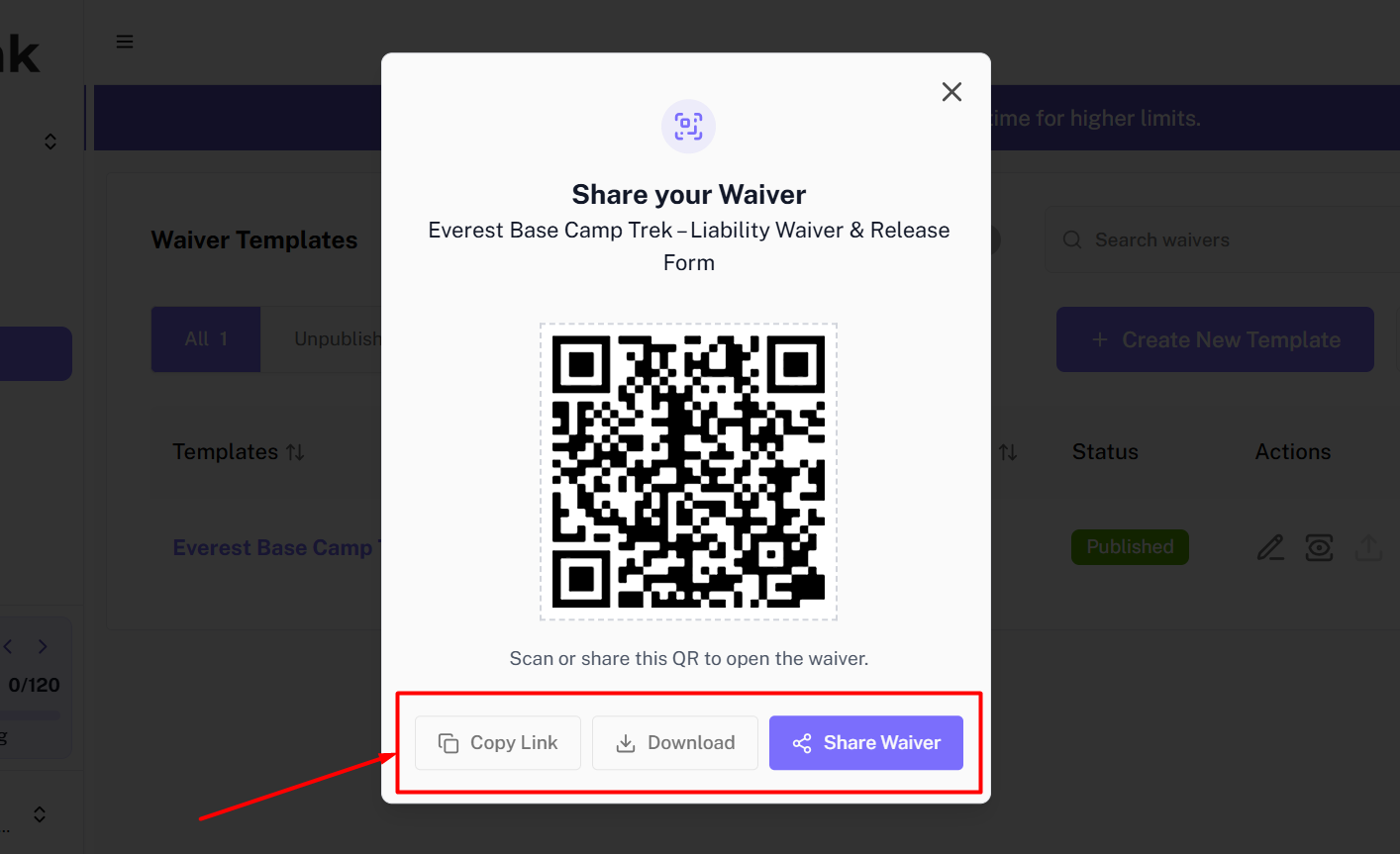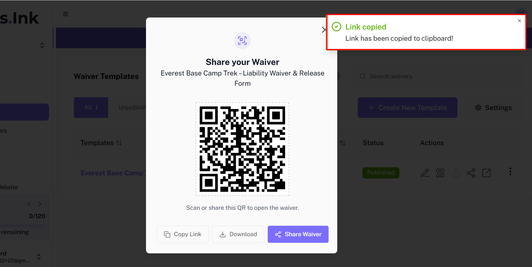 If you choose this option, you can directly copy the waiver link to your clipboard or download the QR code image to share it with your participants.
