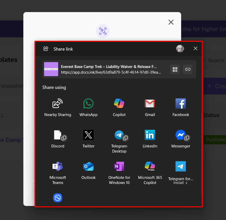 → Choose your preferred sharing method from the available options (e.g., Copy Link, Download QR Code, Share Link directly).