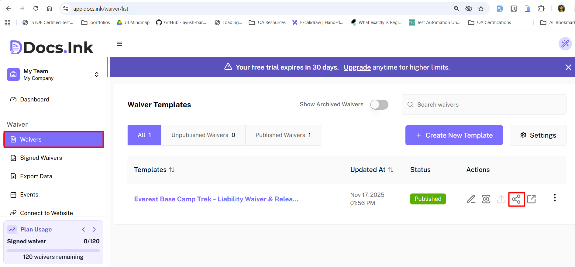 Once you’re in Waivers Tab, → Click on the Share icon of the waiver you want to share from the List.