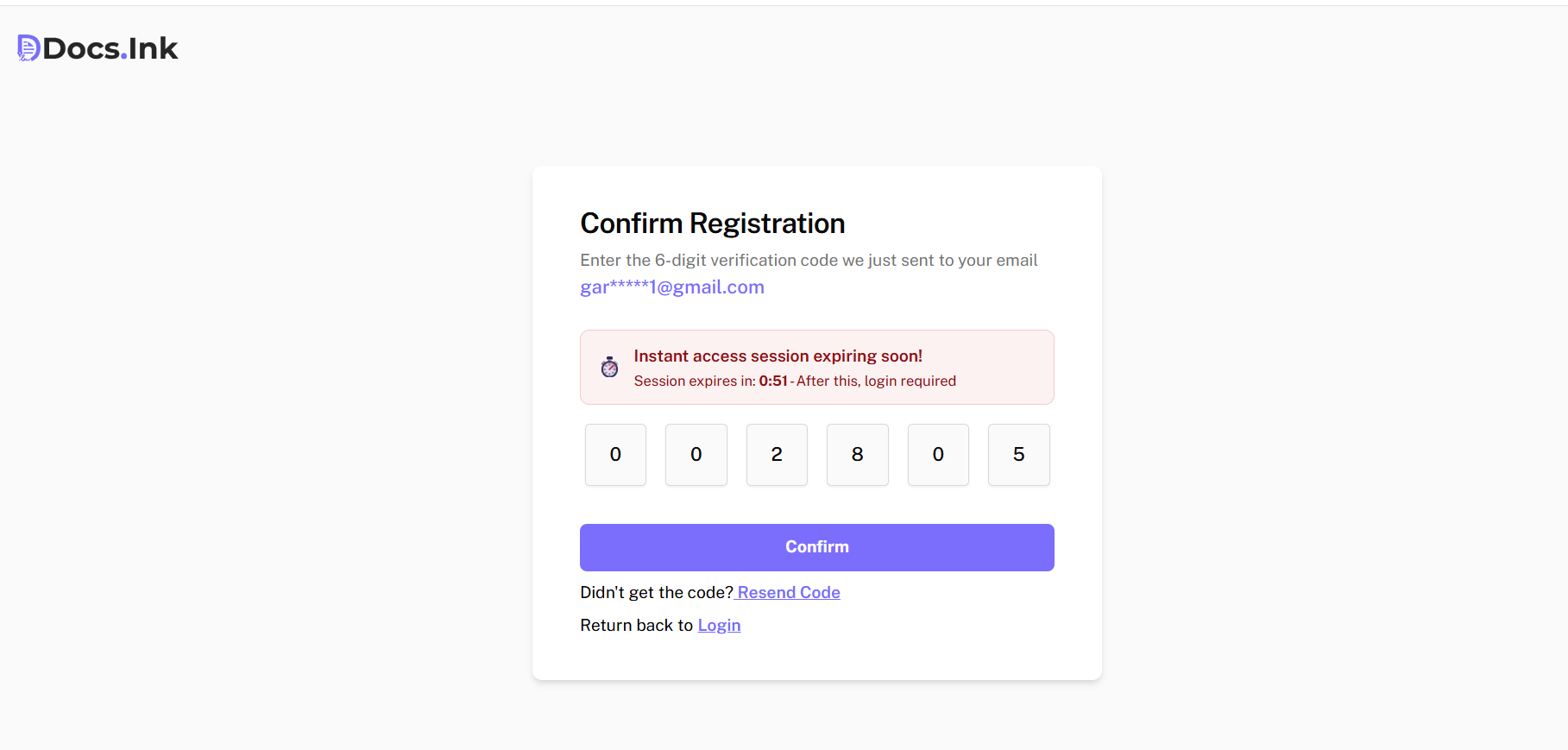 → Click the ‘Register’ button to create your account. Check your email inbox for a verification email from Docs.ink.