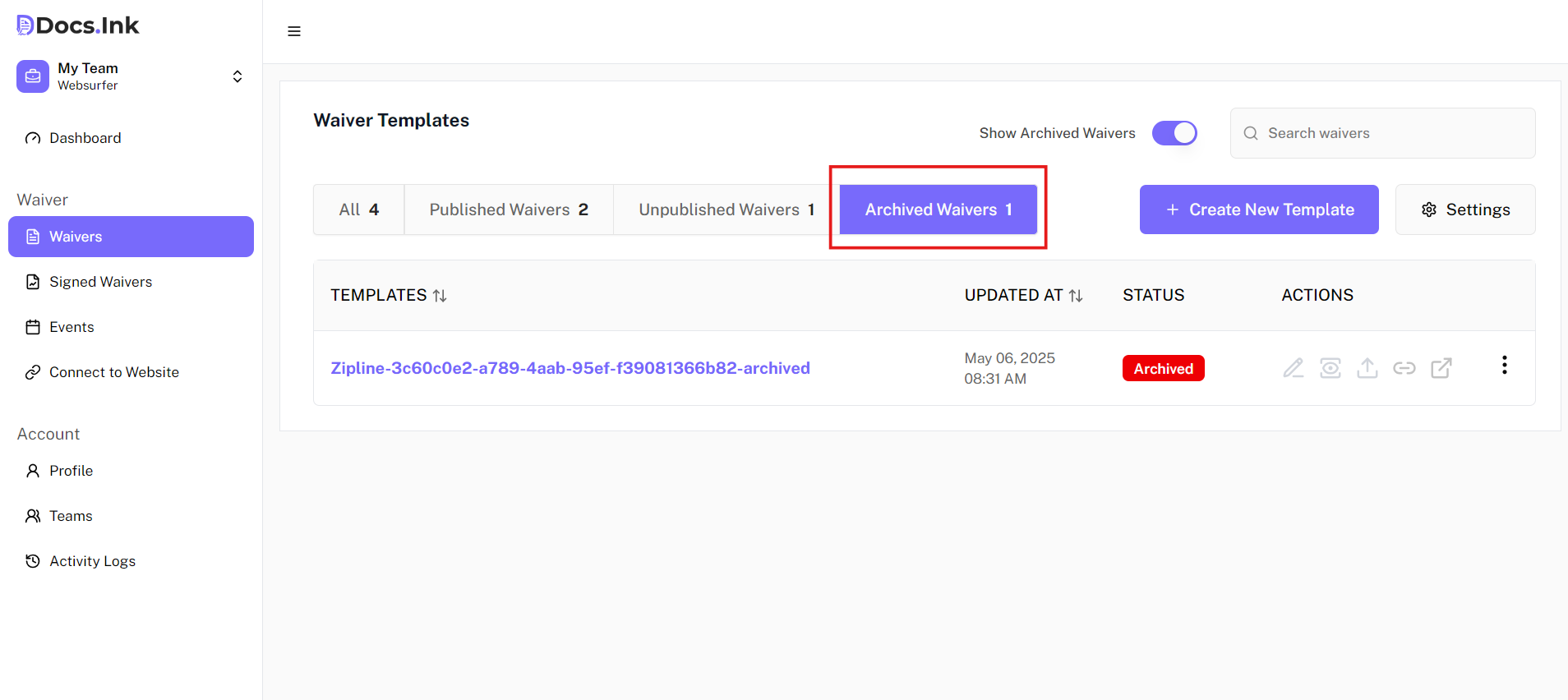 Dashboard > Waiver Template > Toggle “Show Archived Waiver” > Click “Archived Waivers” Tab