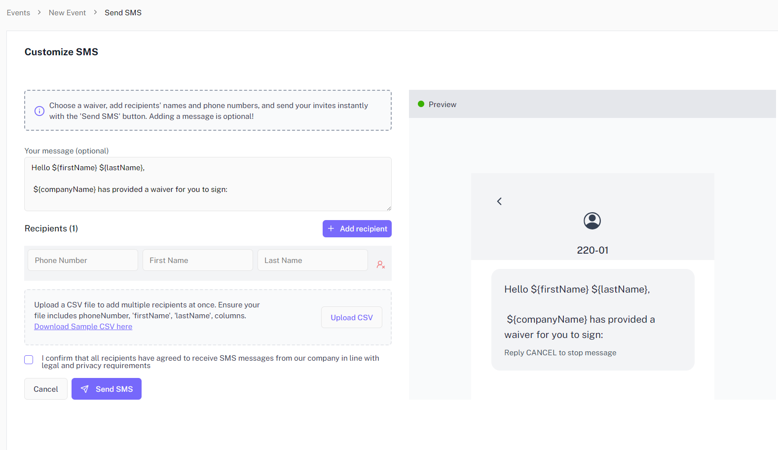 If you click Send SMS invite, you need to add Phone Number, First Name, Last Name, or upload csv for bulk upload. Similar process if you want to send via email but you need enter email instead of a Phone Number