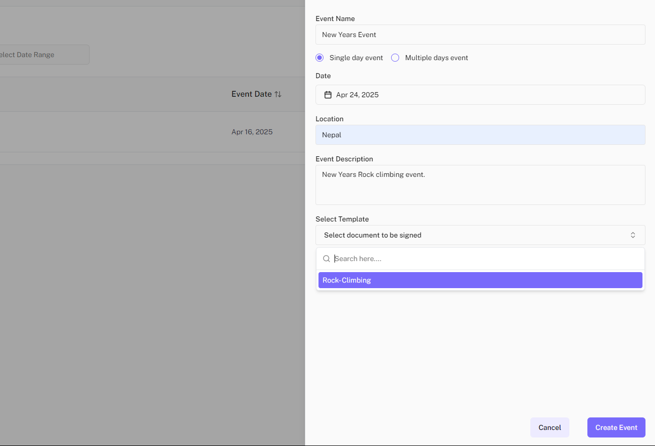 - Description: A short description of the event. This will be shown to everyone who needs to sign the event waiver.